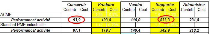 Si on calcule la "performance par activité" définie comme la contribution divisée par les couts associés on voit que ACME obtient d'excellentes performances dans la plupart des activités: