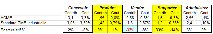 Le résultat obtenu pour ACME est très proche du standard " PME industrielle/ produits série/ réseau de distribution " comme le montre le tableau ci joint.